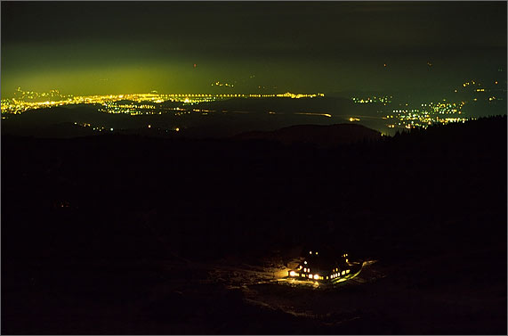 Schronisko zanurza się w ciemności, na niebie pierwsze gwiazdy.